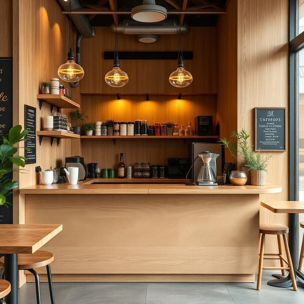 Quán nhỏ: chọn Minimalism, vật liệu MDF chống ẩm + đá nhân tạo.