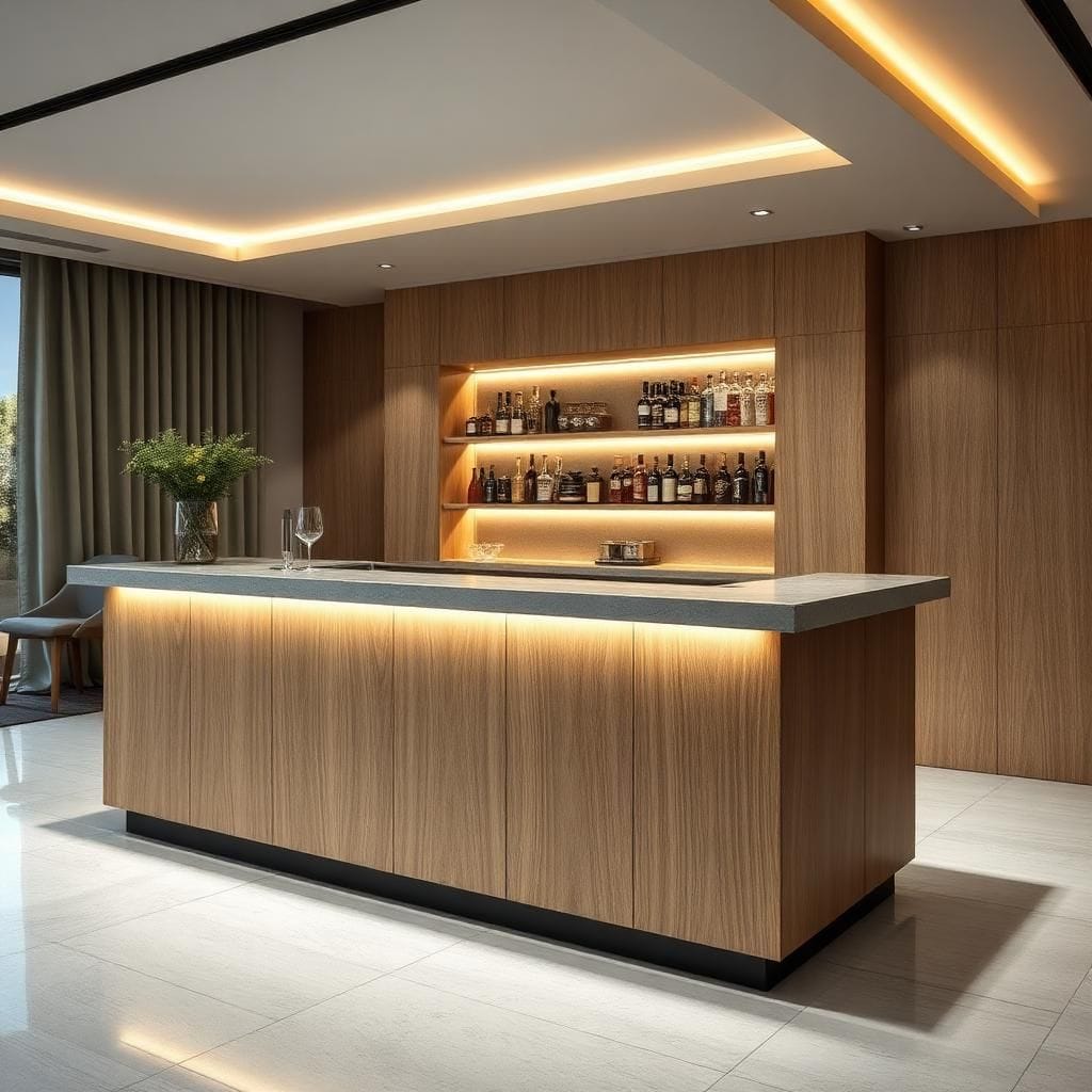Giải pháp: Quầy bar Luxury với gỗ óc chó, marble Ý và inox mạ vàng, tích hợp hệ thống ánh sáng nghệ thuật.