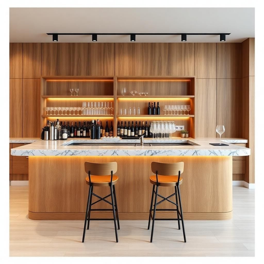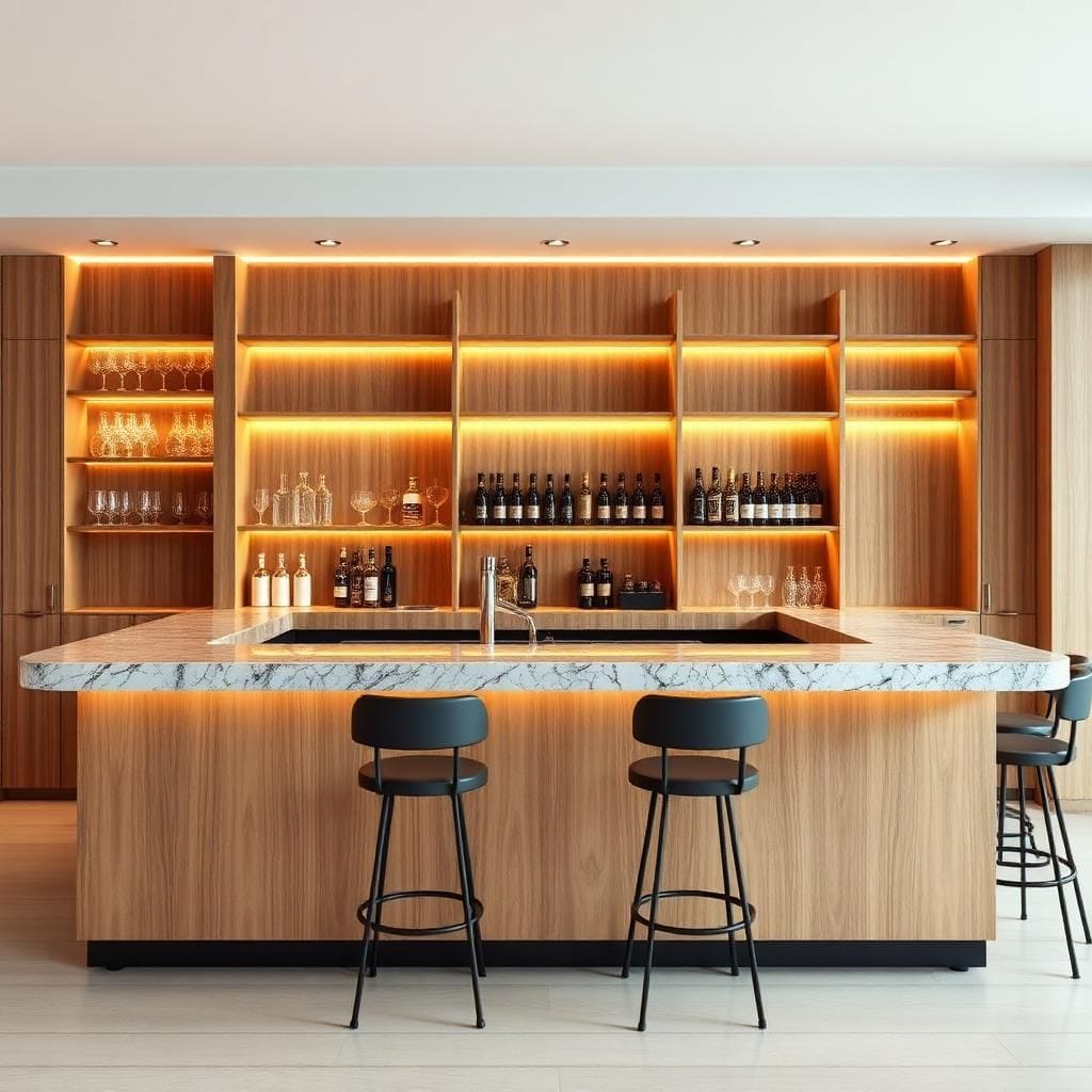 Quầy bar marble trắng Ý, kệ rượu gỗ sồi, đèn LED âm.