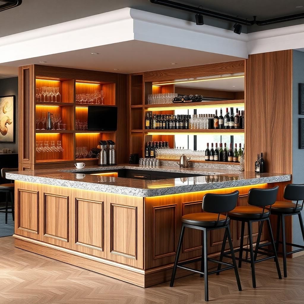 Đây là dạng quầy bar cao cấp, yêu cầu thiết kế sang trọng với vật liệu bền đẹp như đá marble, granite, quartz kết hợp cùng kim loại cao cấp. Quầy bar thường được chăm chút kỹ lưỡng về đường nét, tỷ lệ và chi tiết hoàn thiện nhằm thể hiện đẳng cấp của không gian nhà hàng, lounge hoặc khách sạn. Ngoài việc tích hợp kệ rượu, hệ thống ánh sáng LED và các thiết bị chuyên dụng, thiết kế còn chú trọng đến hiệu ứng ánh sáng – màu sắc để tạo chiều sâu và cảm xúc cho không gian. Sự kết hợp hài hòa giữa vật liệu cao cấp và bố cục công năng hợp lý không chỉ nâng tầm trải nghiệm khách hàng mà còn góp phần khẳng định vị thế thương hiệu, gia tăng giá trị và tính cạnh tranh cho mô hình kinh doanh.