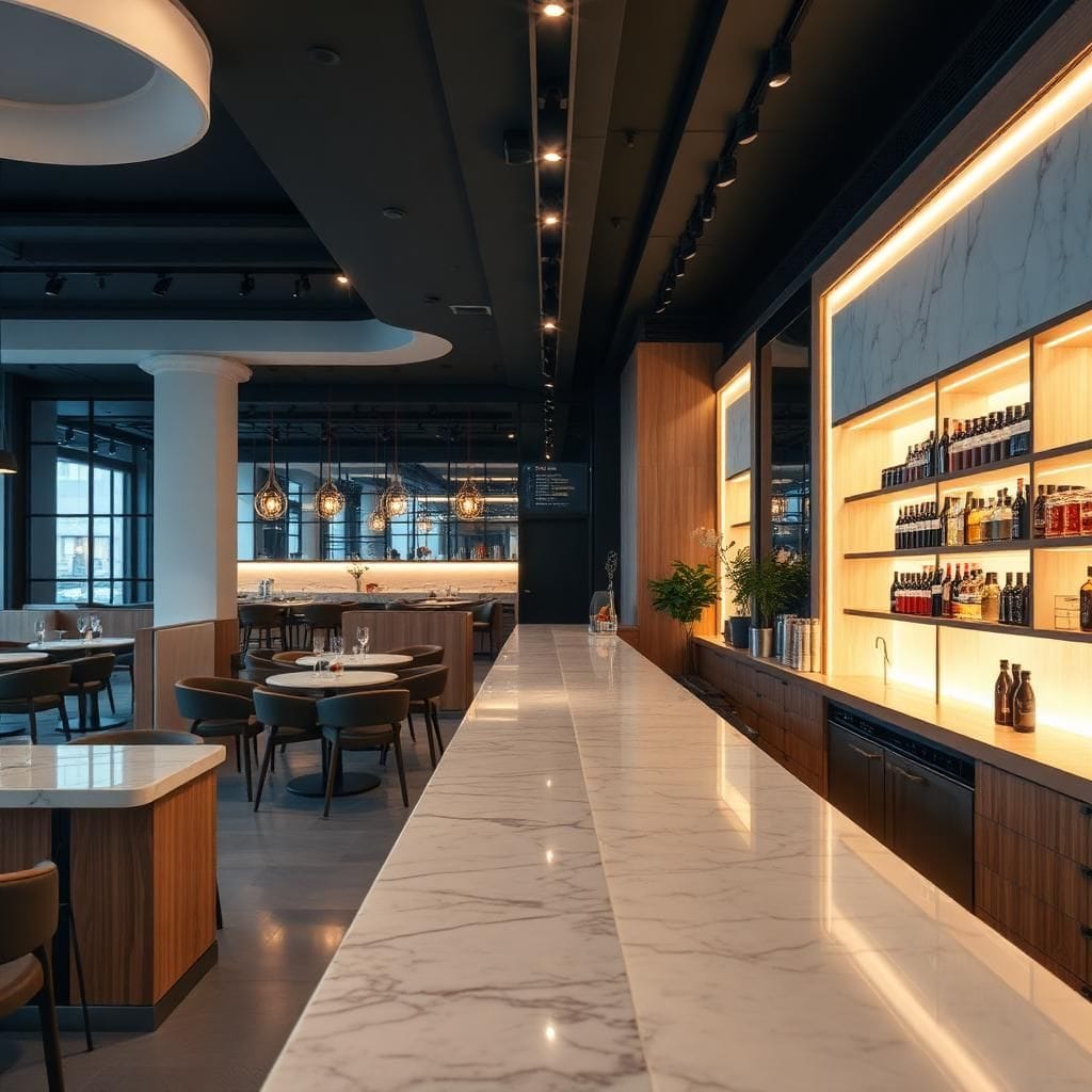 Tùy ngân sách và phong cách quán mà chọn gỗ, đá, inox hoặc vật liệu kết hợp.