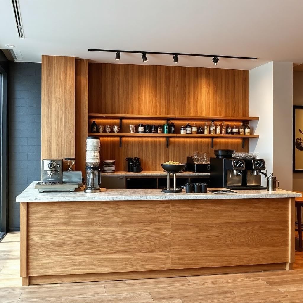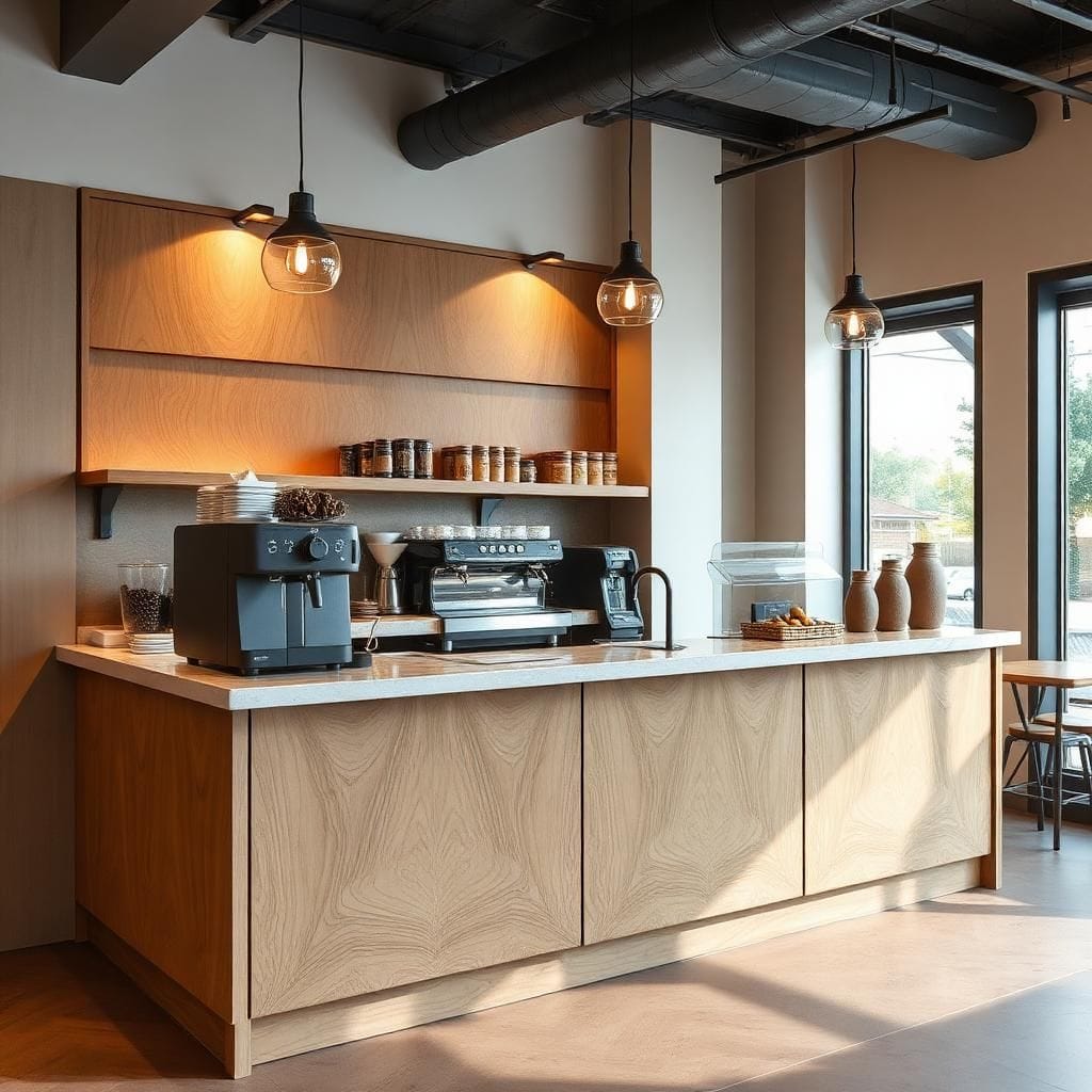 Đồng bộ phong cách: Quầy cafe hòa hợp với không gian quán, nâng cao tính thẩm mỹ.