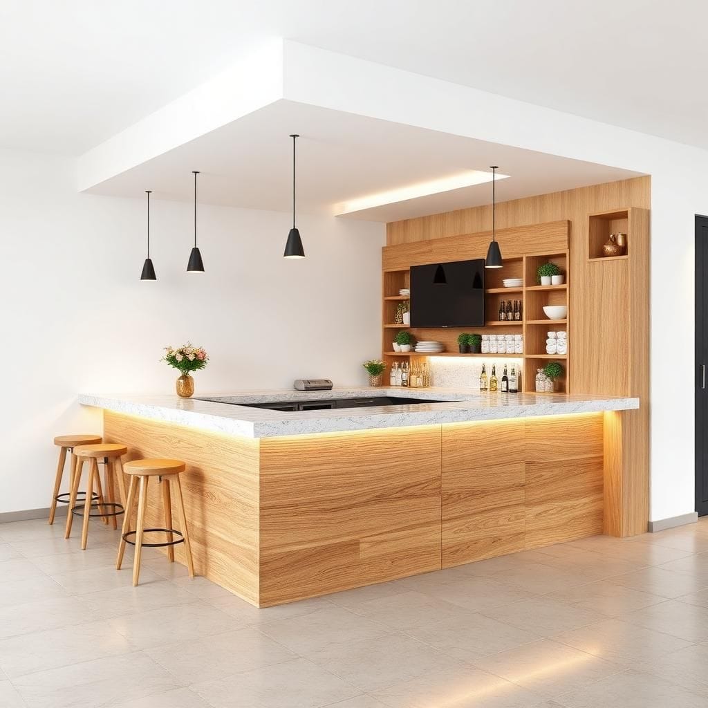 Thiết kế: Gỗ tự nhiên + đá granite, hệ thống đèn LED ẩn.
