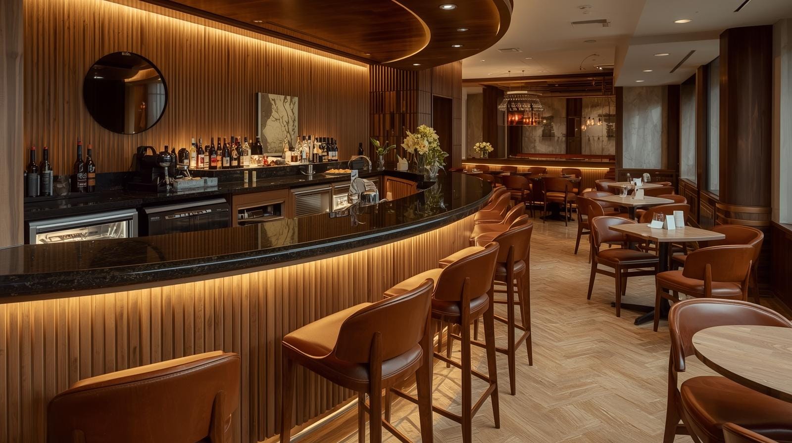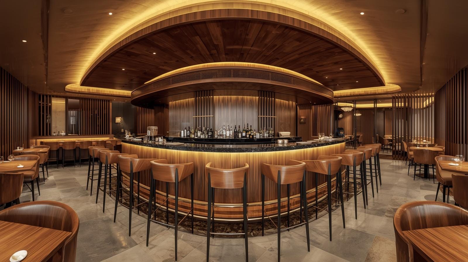 Phong cách thiết kế: Quầy bo cong, phong cách sang trọng → thi công phức tạp hơn.