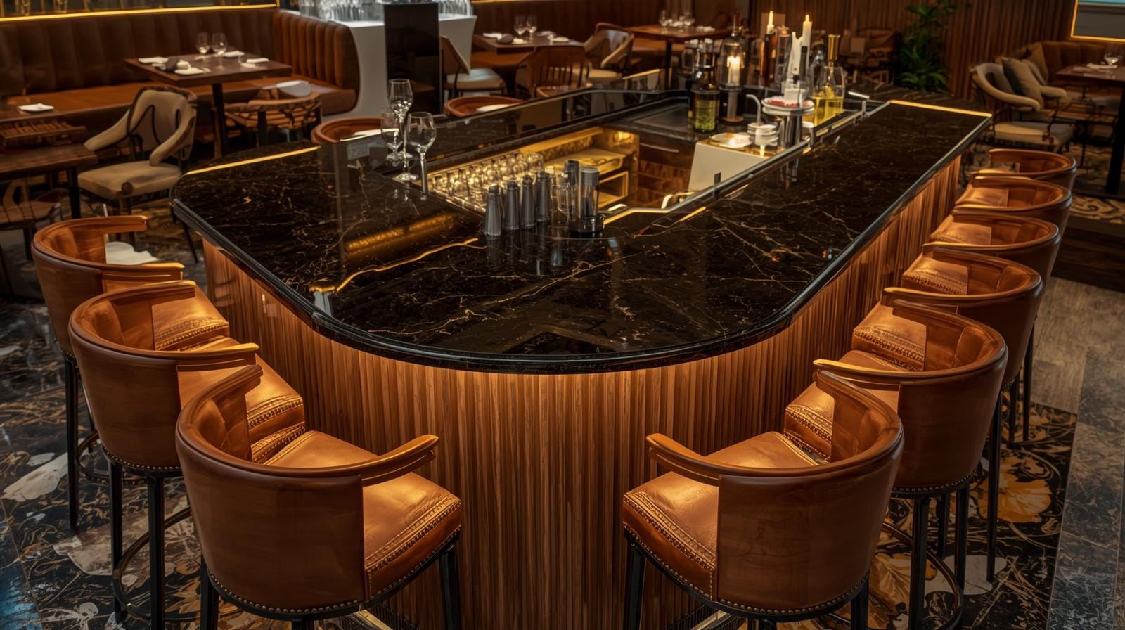 Sang trọng: Đá marble, kim loại mạ vàng, ánh sáng trắng.