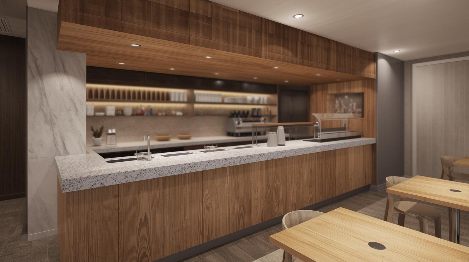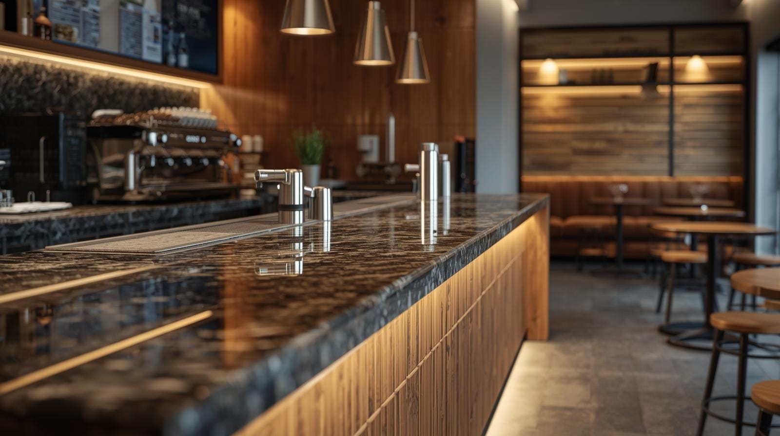 Quầy cafe cần ánh sáng tập trung để nhân viên thao tác chính xác.