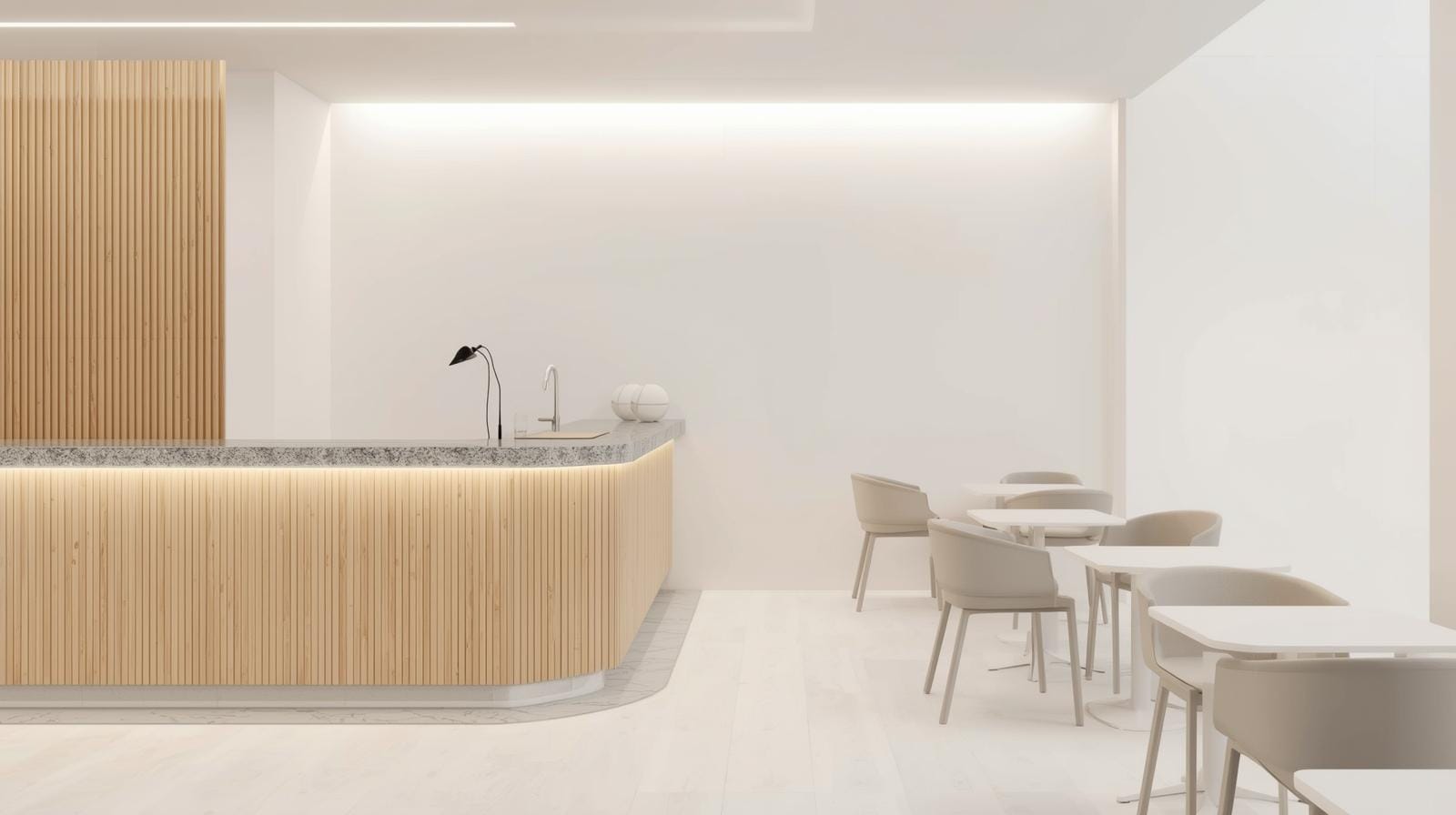 Quầy dài 5m, ốp đá marble trắng vân mây, mặt bàn gỗ sồi tự nhiên